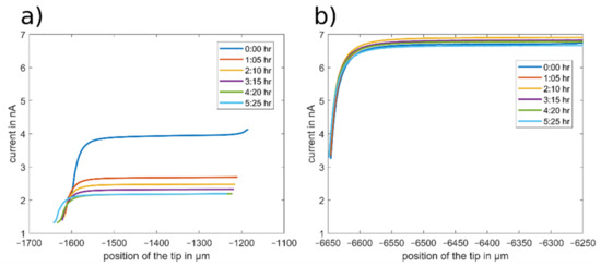 The resulting approach curves towards the glass surface with DBDMB and ferrocene as redox mediators are depicted in Figure 6. The position of the tip (x-axis) was taken directly from the position of the stepper motors of the SECM device. The approach curves that were recorded with DBDMB are drawn in Figure 6a. All approach curves feature a decreasing current at lower tip positions on the left side of the figure. This negative feedback curve indicates an insulating surface, as expected with a glass sample. The curves recorded with DBDMB at different times differ and are not highly reproducible. The bulk current decreases over time from approximately 4 nA to approximately 2 nA within 5 h. The approach curves are also shifted to the left—closer to the sample. The movement of the approach curves towards the sample can occur due to local compression of the substrate in the previous approach curves or due to movements of the tip in the tip holder. With the glass substrate, local compression is unlikely. It is possible that small movements of the tip occur upon contact with the sample. From the approach curve at 4:20 h, the slope of the approach curve decreases when in close proximity to the sample. This indicates that the tip has come into direct contact with the sample. The following approach curve at 5:25 h is shifted towards the sample, indicating that the tip might have slid in its holder.