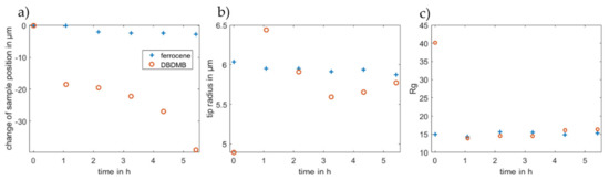 The Rg value (see Figure 7c) gives the ratio of the total tip radius (platinum and insulating parts) and the radius of the platinum tip. The fitted values remain almost constant when considering the approach curves taken after one hour or later for both redox mediators. For ferrocene, the value at t = 0 h does not differ significantly. The Rg value for the approach curve at t = 0 h with DBDMB as the redox mediator is approximately double that in later experiments.