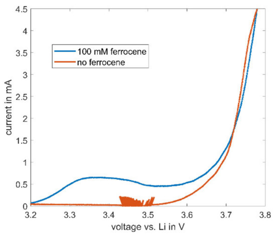 The described high stability of ferrocene in electrolytes consisting of cyclic and linear carbonates enables further possible uses for ferrocene in the field of battery research. During cycling of lithium-ion batteries, ferrocene does not decompose—as such, a characteristic current of ferrocene is observable in CV measurements. The cyclic voltammetry of a NMC622 cathode with 100 mM ferrocene and with the baseline electrolyte is depicted in Figure 8. The observable noise between 3.4 and 4.5 V in the baseline electrolyte always occurs near the onset potential in this setup and is attributed to inaccuracies during voltage control.