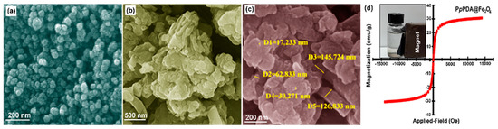 FESEM micrographs of Fe3O4 nanoparticles (a), PpPDA (b), and PpPDA@Fe3O4 nanocomposite (c) in the presence of the [HPy][HSO4] ionic liquid. VSM curve (d) of the prepared PpPDA@Fe3O4 nanocomposite in the presence of the [HPy][HSO4] ionic liquid.
