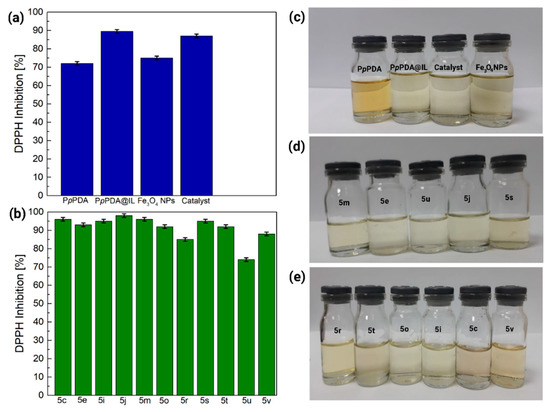 The histograms (a,b) and the photographs (c–e) of antioxidant activity of Fe3O4 NPs, PpPDA, PpPDA@[HPy][HSO4], PpPDA@Fe3O4@[HPy][HSO4], and synthesized polyhydroquinoline derivatives.