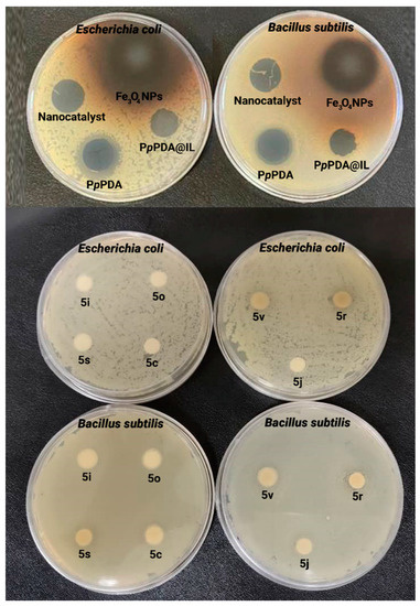 Antibacterial activity: The in vitro antibacterial activities of the Fe3O4 NPs, PpPDA, PpPDA@[HPy][HSO4] (PpPDA@IL), PpPDA@Fe3O4@[HPy][HSO4] (nanocatalyst), and seven of polyhydroquinoline derivatives (5c, 5i, 5j, 5r, 5s, 5o, and 5v) were investigated against Escherichia coli and Bacillus subtilis, and results shown in Table 6 and Figure 6. The results showed that the bare PpPDA and Fe3O4 NPs had good growth inhibitory effects against tested microorganisms, and among them, Fe3O4 NPs exhibited the highest antibacterial activity against both microorganisms while PpPDA@IL was effective against Bacillus subtilis. The nanocatalyst showed lower antimicrobial activity than that of bare minerals against tested bacteria. Moreover, among polyhydroquinoline derivatives, only 5r and 5v had good growth inhibitory effects against tested microorganisms while 5i and 5o showed no effect against tested microorganisms.