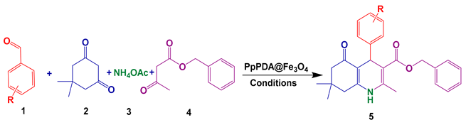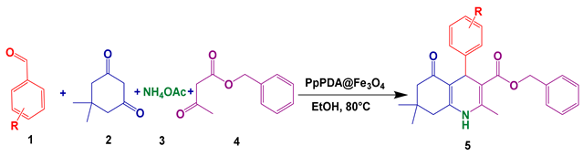 A mixture of dimedone (1.0 mmol), aldehyde (1.0 mmol), benzyl acetoacetate (1.0 mmol), ammonium acetate (1.0 mmol), and PpPDA@Fe3O4 (0.04 g) in ethanol solvent (5 mL) was refluxed. Rection was traced by thin-layer chromatography (hexane/ethyl acetate 5:1). Once the reaction was completed the catalyst was separated easily by an external magnet. Afterward, the crude solid product was filtered and then purified by recrystallization from ethanol.