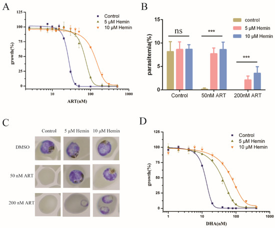 Antimalarial effectiveness of artemisinin was reduced by exogenous hemin. (A) Inhibitory effect of artemisinin was decreased with the addition of exogenous hemin. (B) Hemin antagonized with artemisinin in inhibiting parasite multiplication, suppressing the parasitemia of P. falciparum. (C) Hemin released the inhibition of artemisinin on the development of the parasites after 72 h incubation. (D) Similarly to artemisinin, augmenting heme levels through hemin decreased sensitivity of the parasite to DHA. ART: artemisinin, DHA: dihydroartemisinin. Data are mean ± SD of three independent experiments. The data were analyzed by GraphPad Prism. *** p-value < 0.0005, and ns means no significant change (p-value > 0.05).