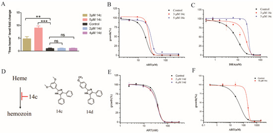 Hemozoin inhibition enhanced free heme levels and decreased sensitivity of artemisinin. (A) 14c but not 14d increased “free heme” levels in P. falciparum. Data are mean ± SD of three experiments. (B) EC50 of artemisinin was increased with 14c. (C) 14c obviously decreased sensitivity of parasites to dihydroartemisinin. (D) Chemical structure of 14c and 14d; (E) 14c analogue 14d had little effect on EC50 of artemisinin. (F) EC50 of artemisinin could also be significantly changed with higher dosages of 14c in the short-pulse assay. Early ring-stage parasites were used. Data are mean ± SD of three experiments. The data were analyzed by GraphPad Prism. ** p-value < 0.005, *** p-value < 0.0005, and ns = no significant change (p-value > 0.05).