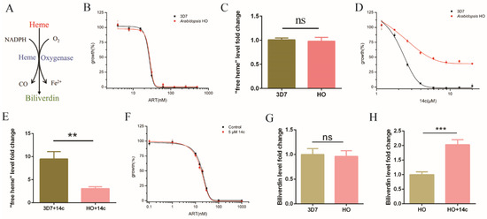 HO neutralized 14c’s effect on heme and artemisinin. (A) HO executes the heme breakdown function. (B) The introduction of HO did not affect the EC50 value of artemisinin in transgenic parasites. (C) “Free heme” level in HO transgenic parasites had no significant change with 3D7 parasites. (D) HO transgenic parasites were more resistant to 14c than the wild-type parasite. (E) Arabidopsis HO1 mitigated the increase in free heme by 5 μM 14c. (F) HO expression in P. falciparum neutralized the antagonizing action of 14c on artemisinin. Data are mean ± SD of three experiments. (G) HO expression-strain-infected RBC had a similar level of biliverdin compared with 3D7-infected RBC. Data are mean ± SD of four experiments. (H) Treatment with 5 μM 14c enhanced biliverdin levels in HO expression-strain-infected RBC. The data were analyzed by GraphPad Prism. ** p-value < 0.005, *** p-value < 0.0005, and ns = no significant change (p-value > 0.05).