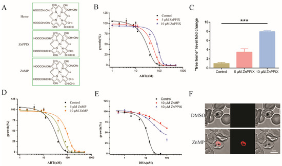 Heme analogues disrupted heme homeostasis and increased EC50 of artemisinin in P. falciparum. (A) Chemical structures of heme, ZnPPIX and ZnMP. (B) EC50 values of artemisinin in P. falciparum were increased by more than twofold in the presence of 10 μM ZnPPIX. (C) ZnPPIX elevated the free heme content by more than sixfold versus the control. (D) EC50 values of artemisinin were increased in the presence of ZnMP. (E) ZnPPIX and ZnMP decreased sensitivity of parasites to DHA. Data are mean ± SD of three experiments. (F) An amount of 20 μM ZnMP could efficiently reach into the parasite within an hour. The data were analyzed by GraphPad Prism. *** p-value < 0.0005.