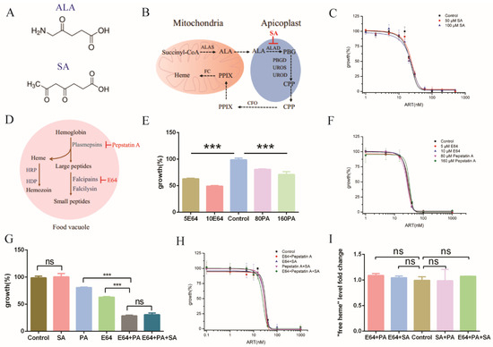 Inhibiting heme biosynthesis and/or hemoglobin degradation had little effect on the effect of artemisinin. (A) Chemical structure of ALA and SA. (B) Heme de novo biosynthesis pathway in Plasmodium falciparum. (C) EC50 of artemisinin in P. falciparum was not changed by the addition of SA. (D) Hemoglobin degradation and hemozoin formation pathway in P. falciparum. (E) Amounts of 5 μM/10 μM E64 and 80 μM/160 μM pepstatin A inhibited the growth of parasites after 72 h incubation. (F) The EC50 value of artemisinin remained unaltered in the presence of cysteine protease inhibitor E64 or aspartic protease inhibitor pepstatin A. (G) An amount of 5 μM E64 was synergistic or additive with 80 μM pepstatin A on malaria growth inhibition. (H) Combinatory use of inhibitors (5 μM E64, 80 μM pepstatin A and 50 μM SA) still produced little effect on artemisinin after 72 h incubation. When three inhibitors were used together, a very mild or marginal effect on the sensitivity of artemisinin was seen. (I) Free heme levels in P. falciparum were not significantly changed with inhibitors (5 μM E64, 80 μM Pepstatin A and 50 μM SA) after 20 h incubation. Data are mean ± SD of three experiments. The data were analyzed by GraphPad Prism. *** p-value < 0.0005, and ns = no significant change (p-value > 0.05).