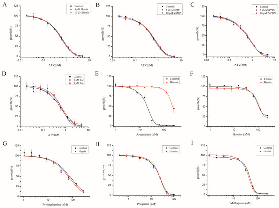 Heme had no effect on other antimalarial drugs. Parasites’ sensitivity to atovaquone had no significant change with 10 μM hemin (A), ZnPPIX (B), ZnMP (C) and 14c (D). Hemin decreased the sensitivity of artemisinin (E) but not antimalarial drugs quinine (F), pyrimethamine (G), mefloquine (H) and proguanil (I). ATV: atovaquone. Data are mean ± SD of three experiments.