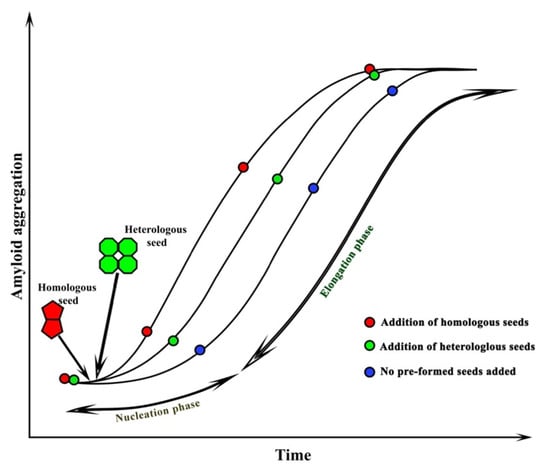Amyloid seeding and aggregation. The addition of preformed seeds reduces the lag phase leading to faster aggregation. The seeds can be homologous or heterologous. Homologous seeds, which have the same nature as the existing nuclei, lead to homologous seeding, whereas the heterologous seeds differ from the initial nuclei and lead to heterologous or cross-seeding.