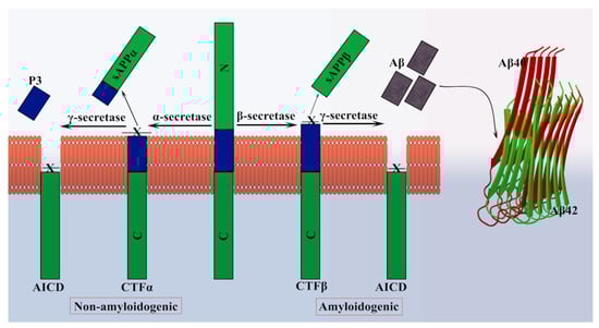 Human APP cleavage pathway. The human APP undergoes proteolytic cleavage in two different pathways: amyloidogenic and non-amyloidogenic. In the non-amyloidogenic pathway, the α-secretases cleave within the Aβ domain to form the α-C terminal fragments (CTFα), and the N-terminal soluble APP (sAPPα). The CTFα is subsequently cleaved by γ-secretase to form P3 and APP intracellular domain (AICD). In the amyloidogenic pathway, the β-secretase initially cleaves APP to form β-C-terminal fragments (CTFβ) and N-terminal-soluble APP (sAPPβ). The CTFβ is then cleaved by γ-secretase to form extracellular Aβ and AICD. The arrangement of Aβ40 (red) (PDB ID: 6TI5) [65] and Aβ42 (green) (PDB ID: 2BEG) [66] in the fibrillar phase are shown on the right. The β-sheet structure of the peptide and the parallel direction can be observed in the figure.