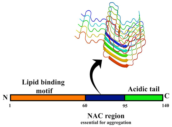 Domain structure of the α-syn protein. The lipid-binding N-terminal domain (NTD) is represented in orange, while the non-Aβ component (NAC) region necessary for the aggregation of α-syn protein is in blue. The C-terminal domain (CTD) of α-syn protein is represented in green. On top, the arrangement of α-syn protein in fibrillar form is shown (PDB ID: 6FLT) [27].