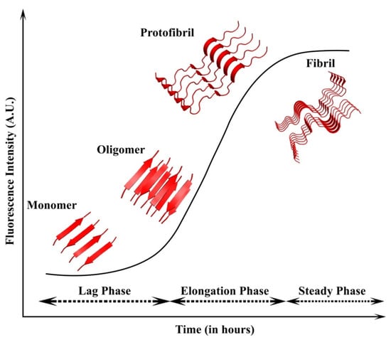 A large number of studies suggest that the oligomeric intermediates that are formed during the aggregation process are toxic, and therefore, their interactions with cell membranes lead to cellular damages and cell death. The exposed hydrophobic regions in the oligomers seem to be responsible for their toxicity. Oligomers of the same size and morphology, but different exposed hydrophobic residues have variable toxicity levels [48]. The size of the oligomeric species is also responsible for toxicity, i.e., the smaller the size of the oligomers, the greater the toxicity it exhibits [48]. This could be due to the rapid diffusion of small oligomers within the cell, and hence, their interaction with different substrates could lead to cellular dysfunction. For instance, it has been shown that the toxic oligomers of Aβ and α-syn are responsible for the cellular damages in AD and PD, respectively [49,50]. Therefore, the toxicity of amyloids might be due to the interaction of oligomeric species with cellular compartments such as phospholipids, RNA, protein receptors, etc.