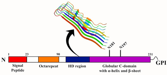 The PrP protein is synthesized from a single gene that codes for 250 amino acids. The N-terminal region of the protein houses five proline residues, followed by glycine-rich octapeptide repeats capable of binding copper. The hydrophobic domain (HD), which is the central segment of the PrP protein, is highly conserved and hydrophobic. The protein also contains a disulfide bridge and two glycosylation sites. The C-terminal region is hydrophobic and contains the signal peptide for GPI- anchor attachment. The important signal peptide in PrPc is the N-terminal signal peptide of 22 amino acids, which is recognized by signal recognizing particles. Therefore, the integrity of the N-terminal signal peptide is crucial for the import and export of PrPc [120]. The most important feature of PrPc is the endoproteolytic processing by two internal cleavage processes, i.e., α-cleavage and β-cleavage. In a healthy environment, PrPc is cleaved between amino acids 110/111 by an α-cleavage process resulting in a 17 kDa C-terminal fragment (C1) and 9 kDa N-terminal fragment (N1). These two fragments are the products of prion metabolism and increase PrPc dimerization. Under the diseased condition, β-cleavage of PrPc at amino acids 90/91 generates a 21 kDa C2 fragment, and this transition from C1 to C2 leads to the PrPsc propagation. The inefficient import of PrP protein to the ER results in its abnormal accumulation, thereby interfering with the cell viability [121]. Apart from the N-terminal region, the HD region (106–126) holds prominence in that it carries amyloidogenic properties and can form fibrils in vitro and produce toxic effects in cultured cells (Figure 6). Curiously, transgenic mice that expressed PrP lacking HD region could not develop transmissible prion infection, suggesting that the HD region was linked to the toxic effects exhibited by the PrP protein [122,123,124]. Furthermore, spectroscopic studies have identified that the PrPc and PrPsc differ conformationally in that the PrPc contains high α-helical content (~42%), with no β-sheets, while PrPsc comprises 30% of α-helix and 45% of β-sheets in its structure [125].