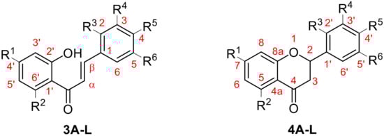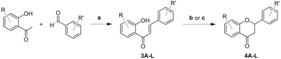 Synthesis of chalcone (3A–3L) and flavanone (4A–4L) derivatives. Reaction conditions: (a) excess of NaOH in 25 mL of MeOH; (b) basic activation: 5 eq NaOAc in MeOH (20 mL) under reflux; (c) photochemical method: in EtOH at 419 nm, 30 °C for 7 days.