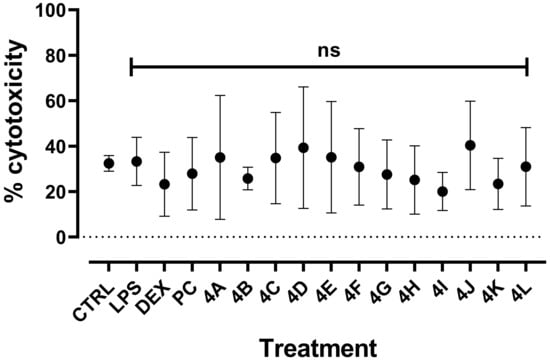 Due to the cytotoxicity of PC, the cytotoxicity to LPS-induced RAW264.7 at 2 µg/mL was evaluated for all flavanone derivatives (Figure 4). Initial cytotoxicity of untreated cells was calculated at 32.41 ± 3.4%, which is consistent with previous observations [27]. No difference with LPS-related cytotoxicity was determined at 33.26 ± 10.61%, and no significant increase was observed for any flavanone at 2 µg/mL, with percentages of cytotoxicity ranging between 20 and 40%. Thus, the potential inhibitory effect of these compounds was investigated at this concentration and compared to PC.
