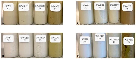 Accelerated thermal stability results of the formulations: O/W before and after the test (A,B), respectively, and W/O before and after the test (C,D), respectively. F1: base formulation without additives; F2: formulation with BHT; F3: formulation with phenoxyethanol (PHEN); F4: formulation with the avocado peel extract (APE).