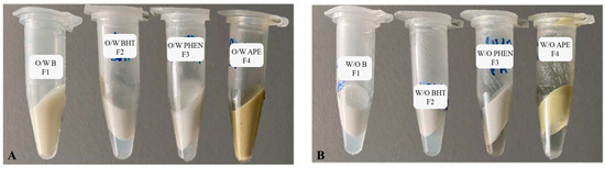Results of the accelerated physical stability test after centrifugation at 5000 rpm for 10 min at room temperature: (A) O/W formulations F1 to F4; (B) W/O formulations F1 to F4. F1: base formulation without additives (negative control); F2: formulation with BHT (antioxidant positive control); F3: formulation with phenoxyethanol (PHEN) (antibacterial positive control); F4: formulation with the avocado peel extract (APE).
