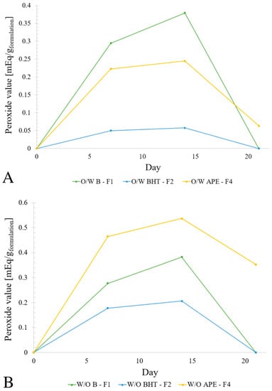 Peroxide values of the O/W and W/O formulations F1, F2 and F4 after the 7th, 14th and 21st day (A,B), respectively.