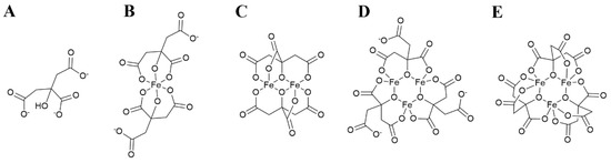 The structure of citrate (Figure 1A) determines a diversity of coordination modes, most commonly as a tridentate ligand, with coordination of Fe3+ occurring through two carboxylate and the hydroxyl moieties [71]. This coordination mode leaves a free carboxylate capable to bind another Fe3+ ion, which favors the formation of polymeric complexes. To date, monoferric dicitrate ([Fe(Cit)2]5−), diferric dicitrate ([Fe2(Cit)2]2−), diferric tricitrate ([Fe2(Cit)3]6−) and nonairon octacitrate ([Fe9O(Cit)8]7−) complexes have been isolated and their crystal structure has been determined [71,72,73,74] (schematic representation in Figure 1B,C). Species with 3 ferric ions ([Fe3(Cit)3]3− and [Fe3O(Cit)3]5−) have been identified by mass spectrometry [71,75,76] (Figure 1D,E).