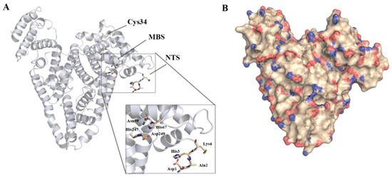 Human serum albumin structure (PDB: 1BM0 [94]). (A) Known metal ion binding sites in HSA: NTS (N-terminal site), MBS (Metal Binding Site A) and Cys34 (reduced cysteine at position 34). (B) Surface map from HSA, highlighting sidechain oxygen atoms from aspartate and glutamate residues (red) and sidechain nitrogen atoms from arginine and lysine residues (blue). The 4 N-terminal amino acid residues in the protein sequence were absent from the crystallographic structure and were manually modelled for this representation.