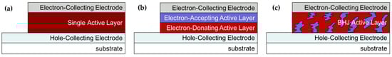 Schematic diagram of OSCs with (a) single active layer structure, (b) bilayer heterojunction structure, and (c) bulk heterojunction structure [].