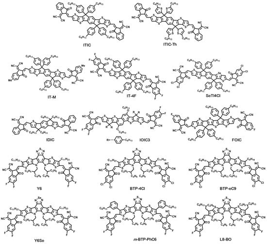 Generally, there are two main strategies for obtaining efficient NFAs, including imide-based NFAs and A-D-A type NFAs. In this section, we focus on the A-D-A type NFAs, where a conjugated “push–pull” structure was applied. In A-D-A type, “A” and “D” represent the electron-withdrawing and electron-donating moieties, respectively. The combination of electron-rich and electron-deficient moieties can extend conjugation and decrease bandgap []. In this section, selected small molecular NFAs as shown in Figure 4 are discussed in detail. Correspondingly, device parameters of OSCs based on these efficient small molecular NFAs are listed in Table 2.