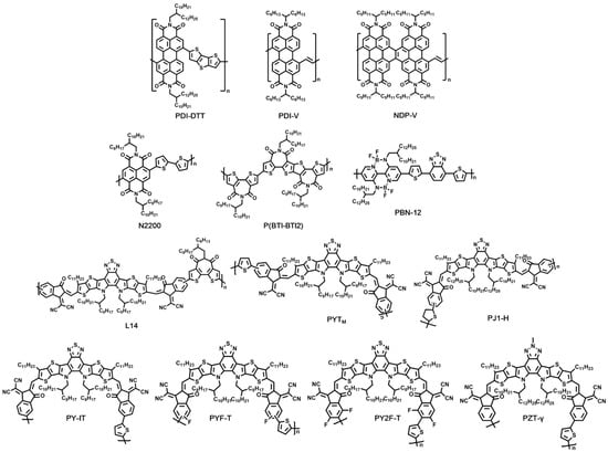 All-polymer solar cells have some unique advantages, including structural flexibility, morphological stability, and outstanding mechanical properties []. To date, the most common building blocks for polymeric NFAs in all-polymer solar cells include perylene diimide (PDI) [,,], naphthalene diimide (NDI) [,,,], bithiophene imide (BTI) [,], and B←N-bridged bipyridine (BN-Py) []. In addition, encouraged by the rapid development of small molecular NFAs, an effective approach for obtaining efficient polymer acceptors has been proposed as well, where the small molecular NFAs were utilized as A units to construct D-A copolymers [,,,,]. Selected polymeric NFAs are displayed in Figure 5. The device parameters of OSCs based on these polymeric NFAs are listed in Table 3.