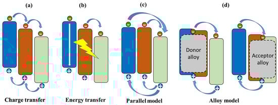 Mechanisms in ternary OSCs: (a) charge transfer (CT) mechanism, (b) energy transfer (ET) mechanism, (c) parallel model, and (d) alloy model [].