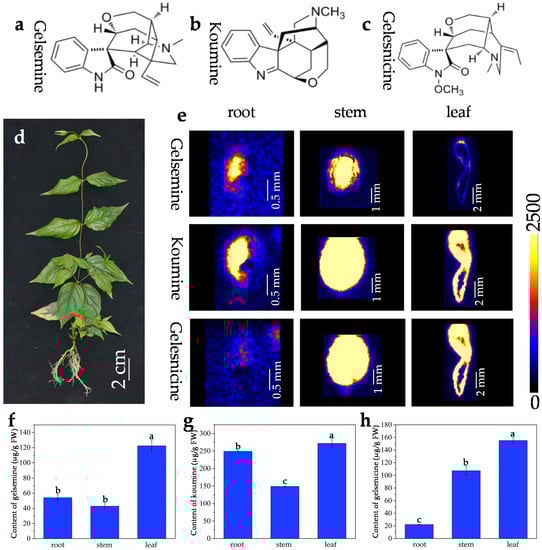 G. elegans plant and distribution of three alkaloids in mature organs/tissues. (a) Chemical structure of gelsemine (a), koumine (b), and gelsenicine (c); (d) mature G. elegans plant (about one year old); (e) in situ visualization of three alkaloids in mature G. elegans organs/tissues by DESI-MSI. The contents of gelsemine (f), koumine (g), and gelsenicine (h) in organs/tissues of mature G. elegans. The error bars indicate the standard deviations of three biological replicates, and statistical significance was evaluated using Microsoft Excel software. Different lowercase letter above the bars represented significance at the level of p < 0.05, and the same letter denotes a non-significant difference between the means.