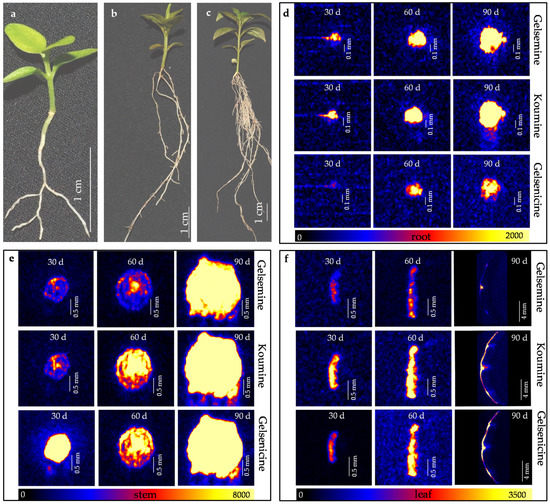 In situ visualization of three alkaloids in organs/tissues of G. elegans during the growth and development. 30 day (a), 60 day (b) and 90 day (c) old seedling of G. elegans; (d) The alkaloid visualization in root of 30, 60 and 90 day old G. elegans seedling respectively; (e) The alkaloid visualization in stem of G. elegans seedling at 30, 60 and 90 day; (f) The alkaloid visualization in leaf of 30, 60 and 90 day old G. elegans seedling respectively.