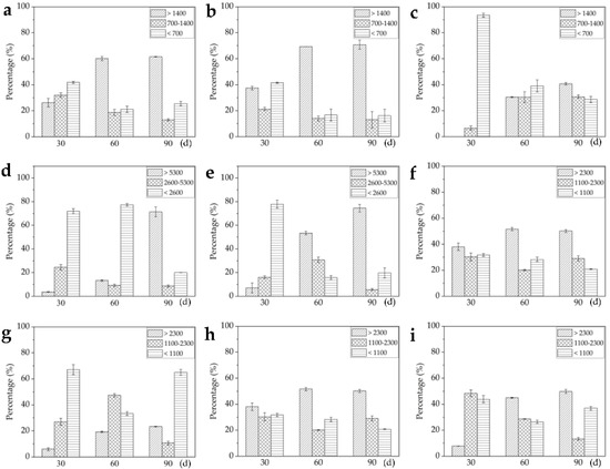 According to the image brightness intensities in Figure 2d–f, the relative contents of three alkaloids were evaluated in different organs/tissues. The image brightness intensities of root, stem and leave were respectively divided into three ranges (roots: >1400, 700–1400, and <700; stems: >5300, 2600–5300, and <2600; leaves: >2300, 1100–2300, and <1100), AP in the three ranges were evaluated in different organs/tissues (Figure 3). The three alkaloids contents in stems were generally higher than in roots and leaves. The AP of gelsemine, koumine, and gelsenicine in intensity range >1400, >5300, and >2300 showed increase trends, which indicated that three alkaloids continuous produced and accumulated during the growth of seedling. The gelsenicine content was very low in 30 day root (APs were 0% in intensity range >1400, 6.6% in intensity range 700–1400 and 93.4% in intensity range <700), but a significant increase was detected at 60 day and 90 day (APs were 30.5% and 40.7%, respectively, in intensity range >1400). In 30 day and 60 day leaves, the distribution of gelsemine, koumine, and gelsenicine did not concentrate in the veins, but in 90 day leaves, three alkaloids began to concentrate mainly in the veins, the results were same as the previous results of the mature leaves (Figure 1b).