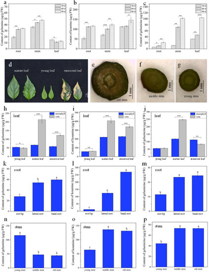 Quantification of three alkaloids in different parts of G. elegans. (a–c) The contents of three alkaloids in the roots, stems and leaves of 30, 60, and 90 day old G. elegans; (d) different old leaf of G. elegans; (e–g) cross-sections of different parts of G. elegans stem; (h–j) contents of gelsemine, koumine, and gelsenicine in different old parts of leaf; (k–m) contents of gelsemine, koumine, and gelsenicine in different old parts of root; (n–p) contents of gelsemine, koumine, and gelsenicine in different old parts of stem. The error bars indicate the standard deviations of three biological replicates, and asterisks represent statistically significant differences as determined by Fisher’s least significant difference (* p < 0.05, ** p < 0.01, *** p < 0.001). The presence of the same lowercase letter denotes a non-significant difference between the means (p < 0.05).