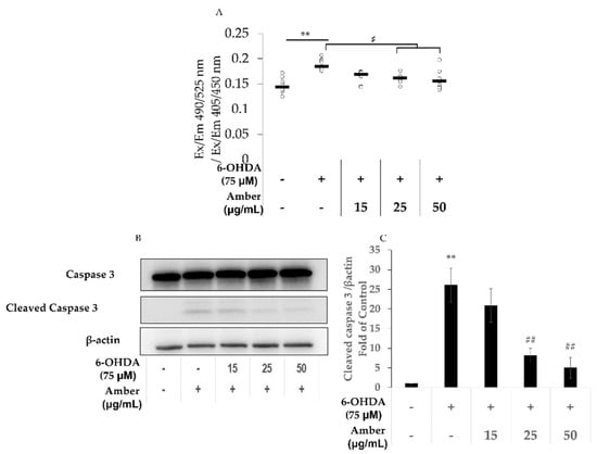 To evaluate the effect of amber extract on apoptosis, the apoptosis assay was performed, and the protein expression levels of caspase-3 were measured. Cells treated with 75 µM 6-OHDA showed a significant increase in cell death and cleaved caspase-3 protein levels when compared with cells in the control group. In contrast, apoptosis and cleaved caspase-3 protein levels were lower in the amber-extract-treated group than in the 6-OHDA group (Figure 2A–C).