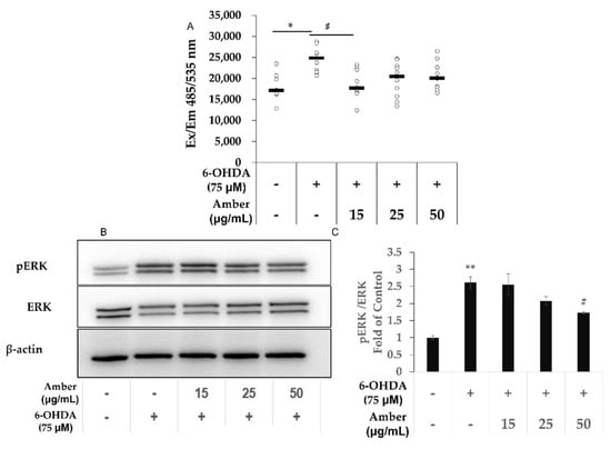 Effect of amber extract on 6-hydroxydopamine (6-OHDA)-induced intracellular reactive oxygen species (ROS) generation: SH-SY5Y cells were cultured in DMEM/F12 medium with 10% FBS. After 24 h of seeding, the cells were pretreated with amber extract for 24 h, and then the medium was replaced with fresh 6OHDA-containing medium for another 6 h for ROS assay, and 24 h for WB. Control (Ct): (6-OHDA/amber) −/−, 6-OHDA: (6-OHDA/amber) +/−, Amber: (6-OHDA/amber) (+/15 µg/mL; +/25 µg/mL, +/50 µg/mL) (A) ROS analyzed using a fluorescence microplate reader. (B) Representative Western blot image of pERK and extracellular signal-regulated kinase. (C) The protein bands were quantified using ImageJ. The results are expressed as the mean ± standard deviation. n ≥ 3 * p < 0.05 vs. Control, ** p < 0.01 vs. Control, # p < 0.05 vs. 6-OHDA.