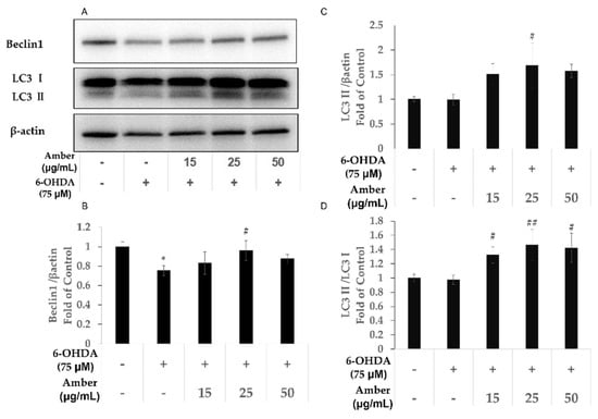To confirm the effect of amber extract on autophagy, the protein expression levels of autophagy-related genes, Beclin-1, and LC3 were measured. We observed that 6-OHDA decreased the protein levels of Beclin-1, but had no significant effect on LC3-II levels. However, the protein levels of Beclin-1 and LC3-II were higher in the amber-extract-treated group than in the 6-OHDA group (Figure 4A–C). Furthermore, we measured the LC3 II/LC3 I ratio as another marker of autophagy. Cells treated with 6-OHDA showed no significant differences in the LC3 II/LC3 I ratio compared with cells in the control group; however, the LC3 II/LC3 I ratio was increased in the amber extract group (Figure 4D). These results suggest that amber extract promotes autophagy in SHSY5Y cells.