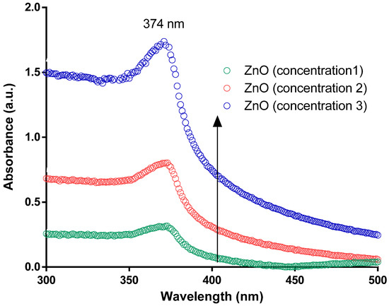Spectroscopic analysis was performed to determine the biosynthesis of ZnO NPs. UV-vis was recorded at different time points while the concentration of the plant extract and the aqueous solution of zinc chloride were fixed. Absorption spectra were recorded at ambient temperature in the range of 300 to 800 nm using a Nanodrop 2000 UV-vis spectrophotometer (Wilmington, DE, USA). The absorbance at 374 nm was observed as a characteristic absorption peak for wurtzite hexagonal crystals of ZnO NPs.