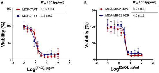 Dose–response curves. (A) Dose–response curve with IC50 of MCF-7/WT and MCF-7/DR cells after treatment with different concentrations of ZnO NPs for 72 h using the MTT assay. (B) Dose–response curve with IC50 of MDA-MB-231/WT and MDA-MB-231/DR cells after treatment with different concentrations of ZnO NPs for 72 h using the MTT assay (n = 3).