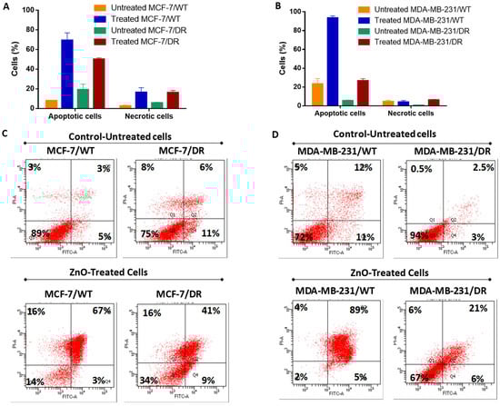 Flow cytometric analysis of the cell death modality. Breast cancer cell lines: MCF-7/WT MCF-7/DR, MDA-MB-231/WT, and MDA-MB-231/DR cells were treated 24 h with 10 µg/mL ZnO NPs and stained with FITC-conjugated annexin V and PI-stained, compared to the untreated control cells. (A,B). Average (%) of apoptotic and necrotic cells after treatment. (C,D) The quadrants in the dot plot indicate viable cells (lower left quadrant), early apoptotic cells (lower right quadrant), necrotic cells (upper left quadrant), and late apoptotic cells (upper right quadrant) (n = 3).