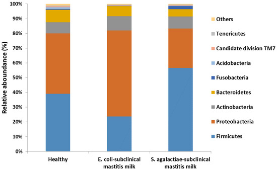 The relative abundance of bacterial phyla in milk from healthy cows and cows with subclinical mastitis.