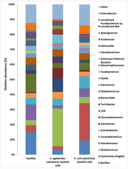 Two phyla dominated in the samples of milk obtained from healthy cows: Firmicutes and Proteobacteria. Their abundance in the bacterial population was similar and amounted to 39% and 41%, respectively. Other notable phyla present in the milk samples were Actionobacteria (7.5%) and Bacteroidetes (8.5%). The ratio of the remaining phyla of bacteria was lower than 1%. On the contrary, in milk samples with an increased number of SSCs, the relative presence of bacteria changed significantly. Bacteria belonging to Proteobacteria (58.3%) were dominant in the samples in which E. coli was found. Meanwhile, the ratio of Firmicutes was equal to 23.7%. In turn, in the samples with the presence of S. agalactiae, bacteria belonging to Firmicutes dominated (56.7%), while the ratio of bacteria belonging to Proteobacteria decreased to 26.6% (Figure 1).