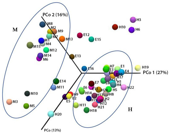 Principal coordinate analysis (PCoA) based on the Bray–Curtis index of bacterial metapopulations in milk (raw data). H1–H24, healthy milk; M1–M15, subclinical mastitis milk with S. agalactiae; E1–E16, subclinical mastitis milk with E. coli.