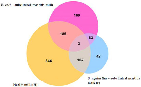 Comparative metagenomics of the microbiota of milk from healthy cows and milk from cows with subclinical mastitis (p = 0.01) confirmed that the bacteria present in the milk (S. agalactiae and E. coli) significantly changed the composition of the cow’s milk microbiome. As many as 346 OTUs were unique and only found in cow’s milk. In subclinical mastitis milk, there were 42 unique units for S. agalactiae—subclinical mastitis milk (M), while for E. coli (subclinical mastitis milk (E)), there were 169. There were 185 taxonomic units common to healthy (H) and E. coli (E), while for healthy and S. agalactiae (S), there were only 169 taxonomic units. By contrast, only three OTUs were common to all cases. A Venn diagram is shown in Figure 4.