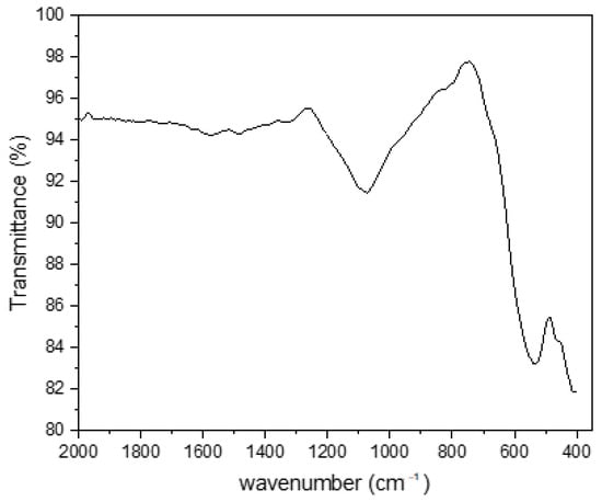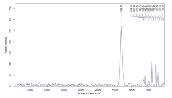 Raman spectra analysis was performed to provide further information for the synthesized composite. As shown in Figure 2, the Raman spectra were recorded between 50 and 4500 cm−1 at room temperature. The strong peak at 1312 cm–1 and the peaks at 606, 405, and 353 cm–1 are the main characteristics of lignin, as the elevation at 1312 cm–1 contributes to the aliphatic (O-H) bending of lignin []. The peak at 655 cm–1 corresponds to cubic-inverse cuprospinel A1g. The peaks at 576 and 493 cm–1 are assigned to cubic-inverse copper ferrite F2g (1), F2g (2). The peak at 289 cm–1 corresponds to Eg and/or E1g of the inverse copper ferrite. The height at 223 cm–1 is related to the inverse cuprospinel F2g (3) [,]. The Raman results are compatible with the FTIR results and prove composite components’ coalescence.