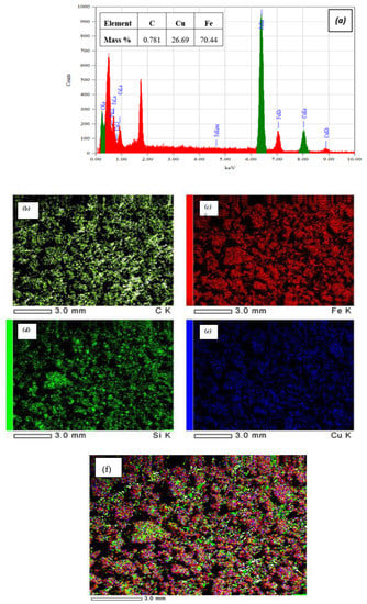 EDX analysis of LCF sample: (a) elemental analysis; (b) C; (c) Fe; (d) Si; (e) Cu; (f) mapping of the LCF.