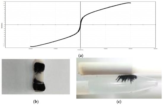 Photographs of (a) magnetization curve of the magnetic LCF sample obtained by VSM, (b) LCF powder loaded on magnetic bar, and (c) LCF powder in water collected with eternal magnetic bar.