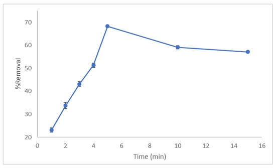 The effect of agitation time on both the % removal and amount of dye adsorbed was studied at different times varied from 0 to 15 min, dye concentration 50 ppm, and amount of adsorbent 0.05 g at room temperature with agitation rate 200 rpm. As shown in Figure 6, the amount of CV adsorbed on LCF versus contact time is initially quite rapid. Then, the adsorption efficiency starts to decrease. The highest adsorption efficiency reached about 68% after 5 min, which could be considered the optimum contact time. This rapid equilibrium points out the adsorption process pursues fast kinetics, where the CV expeditiously occupies the offered adsorption active sites on the LCF until they are saturated. This behavior may be attributed to unoccupied active sites at the adsorbent surface and the high difference between the CV concentration in solution and adsorbent surface. After 5 min, the free adsorption sites drop together with CV concentration. The gradual retardation of adsorption could be because of monolayer formation on the adsorbent surface due to the low availability of vacant sites after attaining equilibrium.