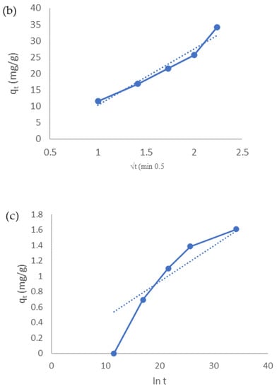 The fits of the kinetic records to the adsorption data are explored with pseudo-first, pseudo-second, intraparticle diffusion, and Elivoch models (Figure 7a–c). The kinetic parameters were calculated from the linearized integral for the four models and are summarized in Table 2. For CV, Lagergren’s model showcased considerable experimental values from the theoretical ones; generally, this line did not permit through the origin, suggesting that boundary-layer diffusion also exists. As listed in Table 1, the values determined using the pseudo-first-order model are similar to practical values than those expending from the other studied models. Its correlation coefficient (R2 = 0.9998) is closer to unity than the others, indicating that CV adsorption on LCF was a pseudo-first-order process. Hence, this process is supposed to be controlled by physical adsorption [,].