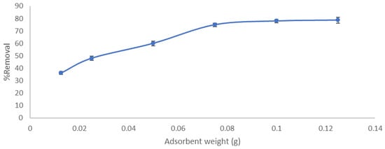 The influence of adsorbent weight on CV removal was inspected by adding different adsorbent masses (0.0125, 0.025, 0.05, 0.075,0.1, and 0.125 g) in 25 mL 10 ppm dye solution, and contact time 5 min at room temperature with agitation rate 200 rpm was tested. As shown in Figure 8, the % removal of CV showed a gradual escalation from 36 to 75% as the adsorbent dosage was augmented from 0.0125 to 0.075 g. After that, an insignificant increase in adsorbent effectiveness occurred up to (78.7%). The increase in dye removal when the adsorbent weight was 0.075 g could be interpreted as increasing removal efficiency in the first stage caused by the small adsorbent amount for the efficient spreading of the nanoparticles in the dye solution; therefore, available extra surface area and more available active sites after the almost constant percentage removal has occurred in the following step may be due to the accumulation of the particle and blocking the active site, which obstructs the reached the CV and its contact to the active site. Therefore, the optimum dosage is found to be 3 g/L []. Similar trends have also been proposed by Cheruiyot et al. in their studies on the removal of crystal violet from aqueous solution using coffee husk as an affordable adsorbent [].