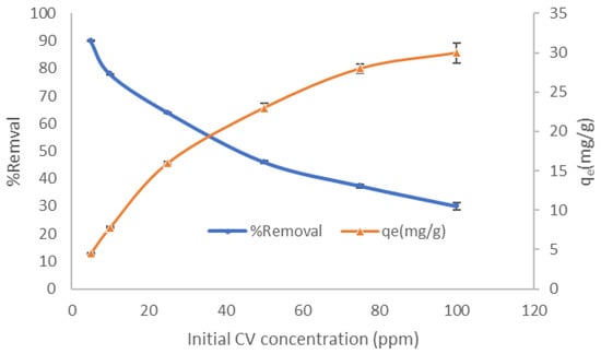 Effect of initial CV concentration on % removal and adsorption capacity using LCF.